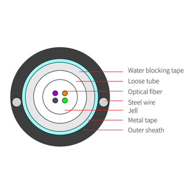 Les fibres nues de 250um sont positionnées dans un tube lâche en plastique à haut module. Les tubes sont remplis d’un composé de remplissage résistant à l’eau. Le tube est enveloppé d’une couche de PSP longitudinalement. Entre la PSP et le tube lâche, un matériau bloquant l’eau est appliqué pour garder le câble compact et étanche. Deux fils d’acier parallèles sont placés sur les deux côtés du ruban d’acier. Ensuite, le câble est complété par une gaine en polyéthylène (PE).
